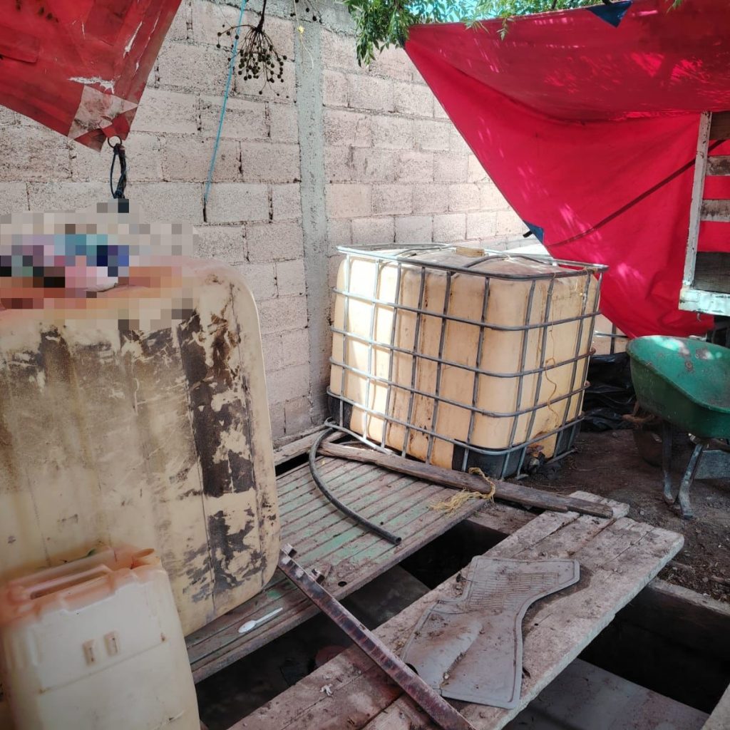 Durante el cateo se aseguraron tres mil 806 litros de hidrocarburo, una motobomba con mangueras, treinta contenedores, tres motocicletas, tres camionetas (una de ellas con redilas), una báscula, una pipa, así como diversas sustancias ilícitas: cocaína, marihuana y metanfetamina. También fueron encontrados tres cartuchos útiles.