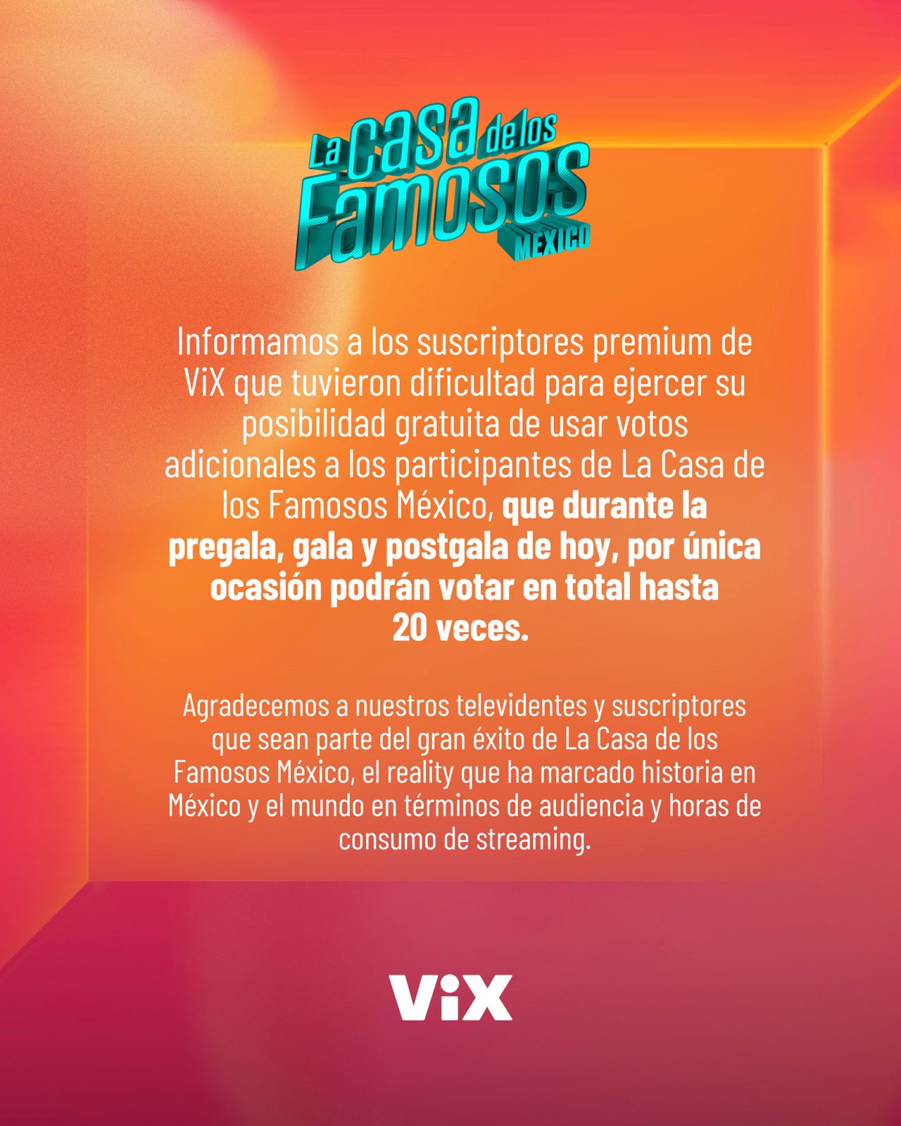 Tras la Gala de Nominación del miércoles, usuarios reportaron fallas en la plataforma de votación, lo que desató rumores de fraude. En respuesta, la producción anunció este viernes una modificación exclusiva para suscriptores de Vix Premium, quienes podrán votar hasta 20 veces durante el día.