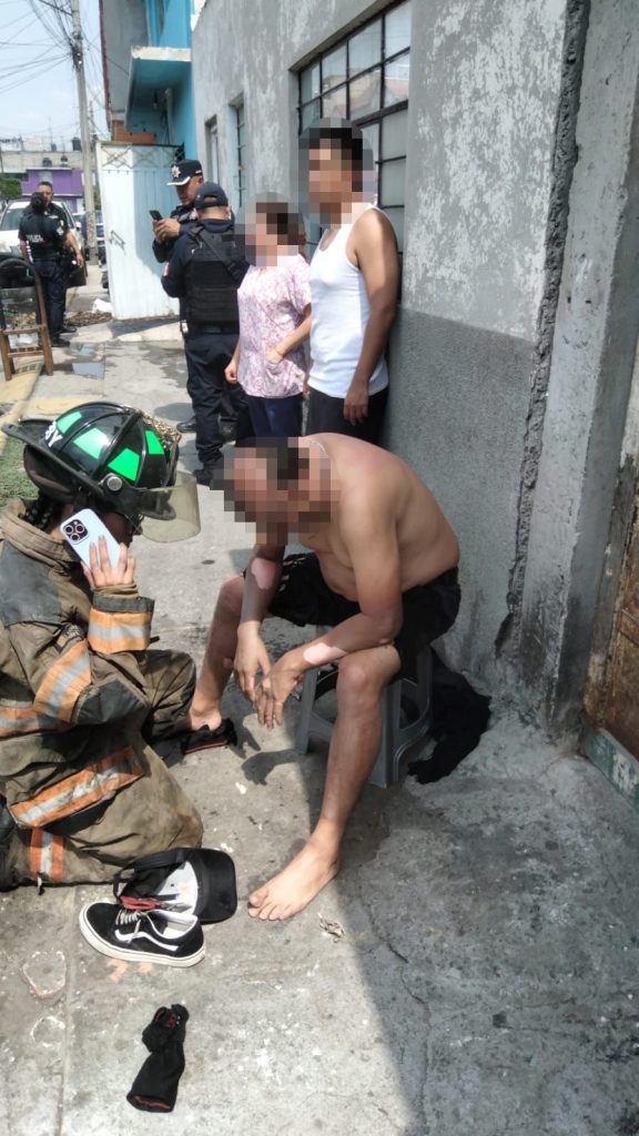 Ecatepec, Méx., a 17 de octubre de 2025. Elementos de Protección Civil y Bomberos atendieron un llamado de auxilio, por el flamazo registrado en una vivienda de la colonia Granjas Valle de Guadalupe y que dejó como saldo un hombre lesionado por quemaduras.