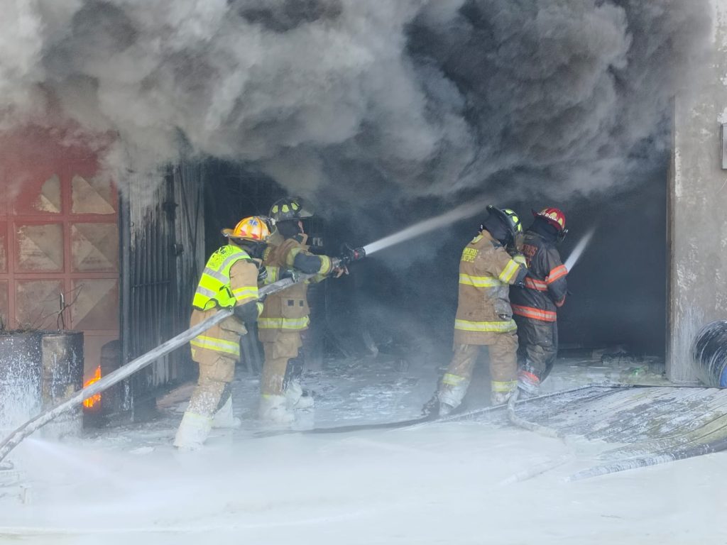 Ecatepec, Méx., a 21 de octubre de 2025. Elementos de la Dirección de Protección Civil y Bomberos de Ecatepec, con apoyo de corporaciones de otros municipios y de la Ciudad de México, controlaron el incendio registrado en un inmueble donde fabricaban salas y colchones en la colonia Hank González; unos 500 habitantes de viviendas aledañas fueron evacuados y una mujer bombero fue trasladada a un hospital por inhalación de humo.