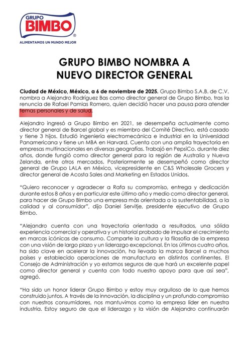Ciudad de México. Grupo Bimbo S.A.B. de C.V. informó el nombramiento de Alejandro Rodríguez Bas como nuevo director general de la compañía, en sustitución de Rafael Pamias Romero, quien decidió renunciar para atender asuntos personales y de salud. El anuncio marca un cambio relevante dentro de la estructura directiva de la empresa panificadora más grande del mundo.