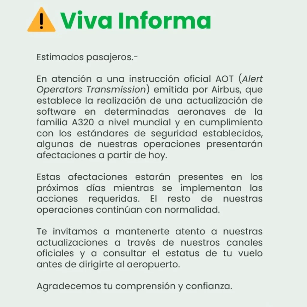 Por su parte, Viva Aerobús informó que se encuentra analizando el alcance total de la orden emitida por Airbus y que, aunque aún no se define el periodo de implementación, podrían presentarse ajustes en sus operaciones.
