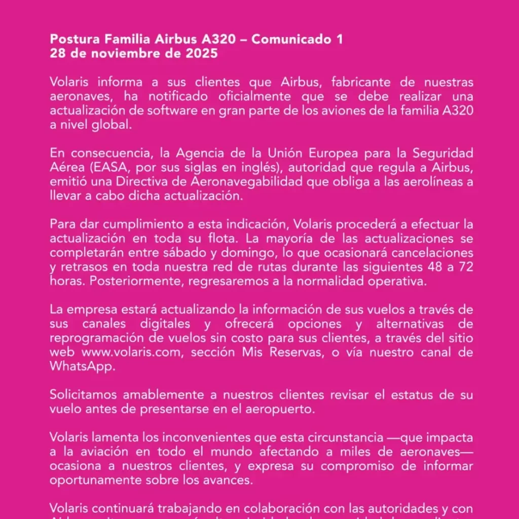 Volaris recalcó que mantiene una coordinación constante con Airbus y con las autoridades aeronáuticas de México, reiterando que la seguridad de pasajeros y tripulaciones es la prioridad absoluta.