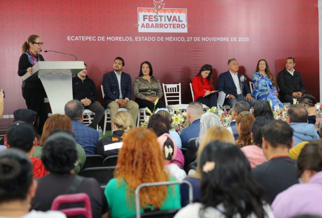 Ecatepec, Méx., a 27 de noviembre de 2025. En la Central de Abasto de Ecatepec se realizó el Festival Abarrotero, que busca fortalecer y modernizar el sector comercial del municipio, donde participaron 3 mil personas, mismo que fue inaugurado por la presidenta municipal Azucena Cisneros Coss, la secretaria de Desarrollo Económico del Estado de México, Laura González Hernández, y el diputado local Octavio Martínez Vargas.
