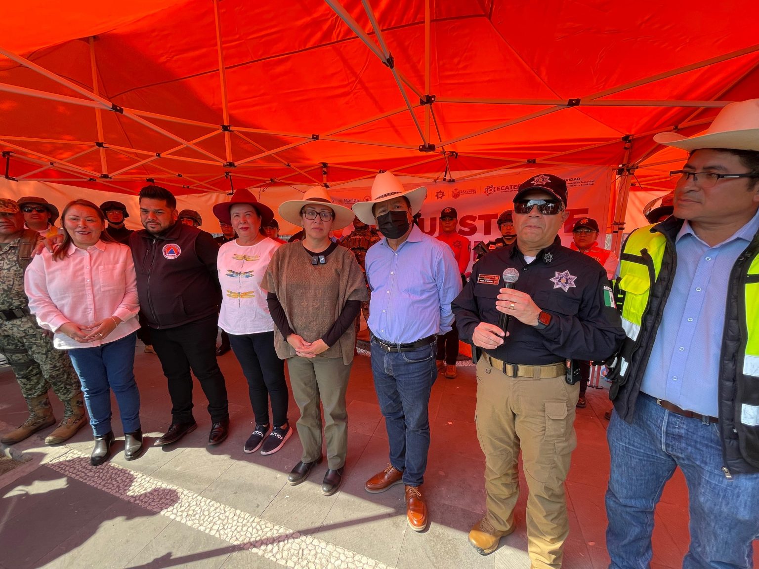 Ecatepec, Méx., a 10 de diciembre de 2025. La presidenta municipal Azucena Cisneros Coss dio el banderazo al operativo “Guadalupano Peregrino Seguro”, que se realizará del 10 al 12 de diciembre, con la participación de 300 elementos y 80 unidades de la policía municipal, Marina, Guardia Nacional, Sedena, policía estatal y Protección Civil para brindar apoyo y seguridad en el trayecto de más de un millón de peregrinos que pasan por Ecatepec con destino a la Basílica de Guadalupe.