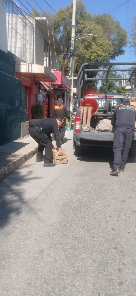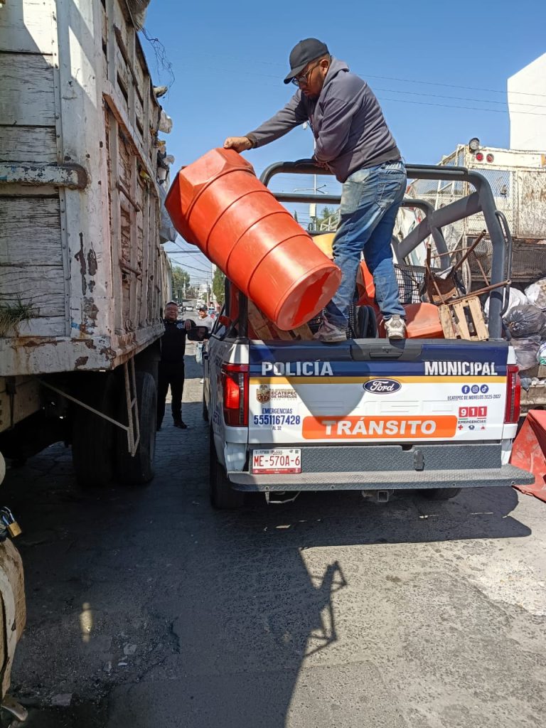 Ecatepec, Méx., 03 de enero de 2026.- A fin de liberar calles y avenidas de obstáculos que impiden el libre estacionamiento de vehículos, policías de Tránsito Municipal retiraron bienes mostrencos en San Cristóbal Centro.
