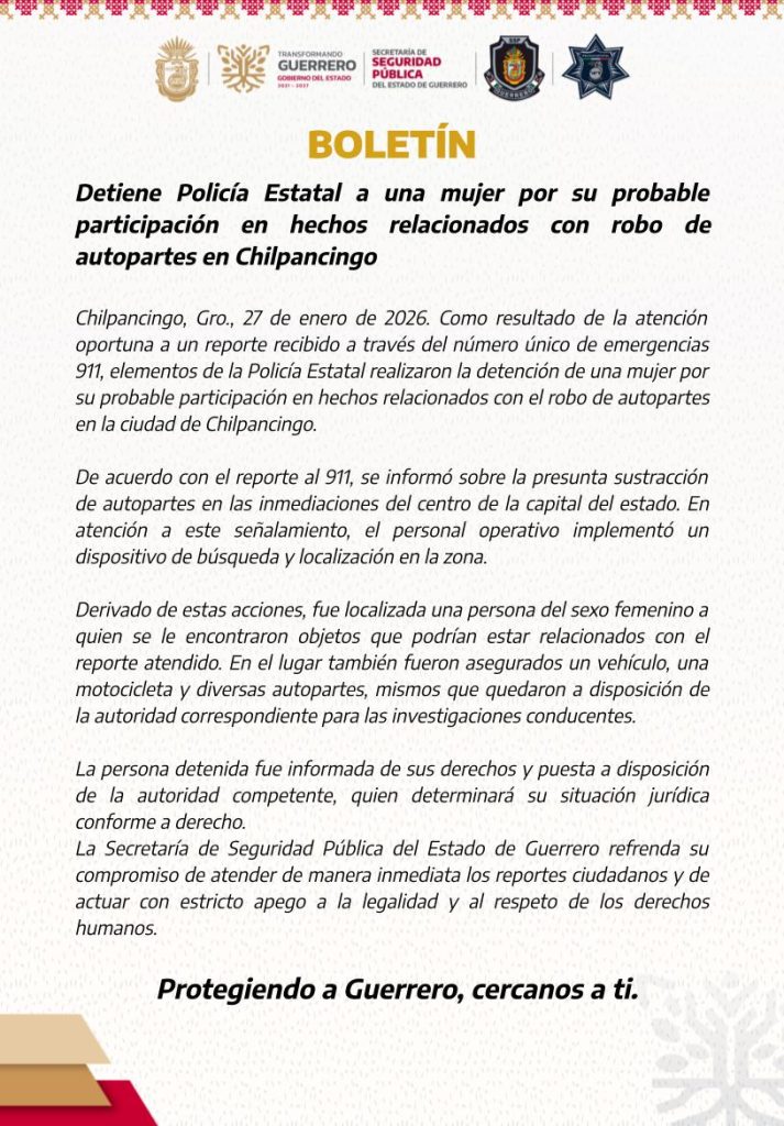 Chilpancingo, Gro., 27 de enero de 2026. Como resultado de la atención oportuna a un reporte recibido a través del número único de emergencias 911, elementos de la Policía Estatal realizaron la detención de una mujer por su probable participación en hechos relacionados con el robo de autopartes en la ciudad de Chilpancingo.