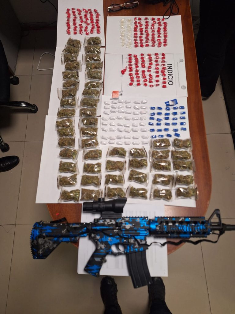 Durante la intervención a los tres sujetos, también se les halló una réplica de arma larga de fuego de plástico color azul, por lo que fueron detenidos Andrés “N”, de 44 años de edad; Edwin Jonathan “N”, de 27 años, y Oscar Iván “N”, de 24 años, todos presentados ante el Ministerio Público por su probable participación en delitos contra la salud en su modalidad con fines de suministro, además de portación, tráfico y acopio de armas prohibidas.