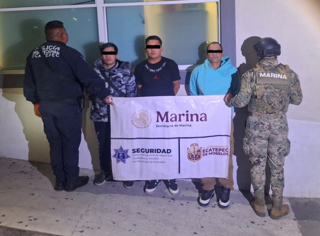 Ecatepec, Méx., a 05 de febrero de 2026. Elementos de la policía municipal detuvieron a tres sujetos en el fraccionamiento Jardines de Morelos Sección Playas, quienes al parecer portaban una réplica de arma de fuego y 339 envoltorios de diversos estupefacientes, por lo que fueron remitidos al Ministerio Público.