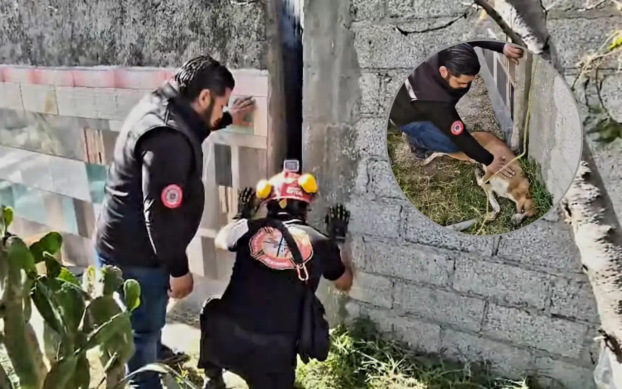 Ecatepec, Méx., 09 de febrero de 2026.- Una perrita que estuvo atrapada entre dos bardas por aproximadamente cuatro días fue rescatada con éxito por elementos de Protección Civil y Bomberos de Ecatepec.